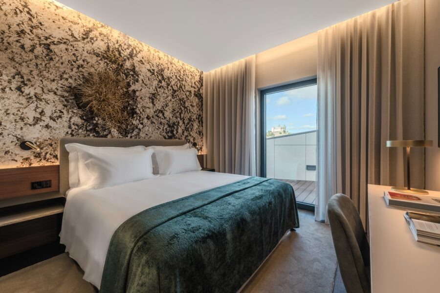 A pedra é o mote, não fosse aquela uma região conhecida pelas pedreiras e grutas que as serras escondem. A associação é clara assim que se entra na receção e espalha-se por cada detalhe do hotel: as alcatifas que se assemelham a padrões naturais, a palete de tons terrosos da mobília, o formato dos sofás, as imagens de Natureza que ilustram cada quarto.