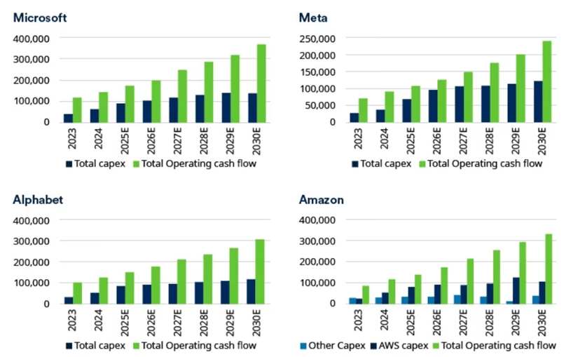 O desempenho do preço das ações dos Magnificent Seven (Alphabet, Amazon, Apple, Meta, Microsoft, Nvidia e Tesla) tem sido impulsionado por um enorme investimento em infraestruturas de IA. Como mostrado na Figura 1, os aumentos do capital nos últimos anos representam uma proporção relativamente pequena dos seus fluxos de caixa operacionais. Os maiores gastadores têm margem para aumentar bastante os gastos se acharem apropriado.