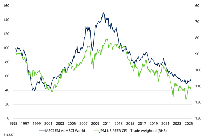 A depreciação do dólar americano proporcionaria condições favoráveis para o desempenho relativo das ações de mercados emergentes, pois alivia as condições financeiras e tem um efeito de tradução positivo, beneficiando o crescimento nominal em dólares e os lucros. O gráfico na figura 2 mostra a correlação inversa histórica entre o dólar americano e os retornos relativos das ações de mercados emergentes. Isto pode combinar-se com avaliações relativas atrativas e uma possível estabilização ou melhoria no retorno sobre o capital próprio (ROE) relativo.