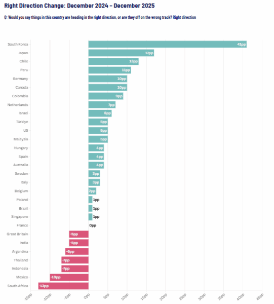 Em 30 países, a proporção que afirma que o seu país está «no caminho certo» aumentou 4 pontos percentuais para dois quintos (41%) desde dezembro passado. Em dezembro de 2024, 22 dos 29 países tinham uma maioria que afirmava que o seu país estava a seguir na direção errada. Em dezembro de 2025, 23 dos 30 países têm uma maioria que acredita no mesmo.