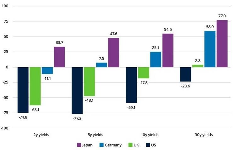 Variação dos rendimentos no acumulado do ano, por país e ao longo da curva (em pontos base)