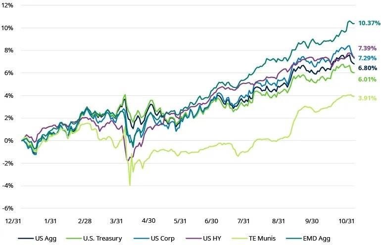 Figura 2: Fortes retornos no acumulado de 2025 na maioria dos sectores do mercado obrigacionista norte-americano
