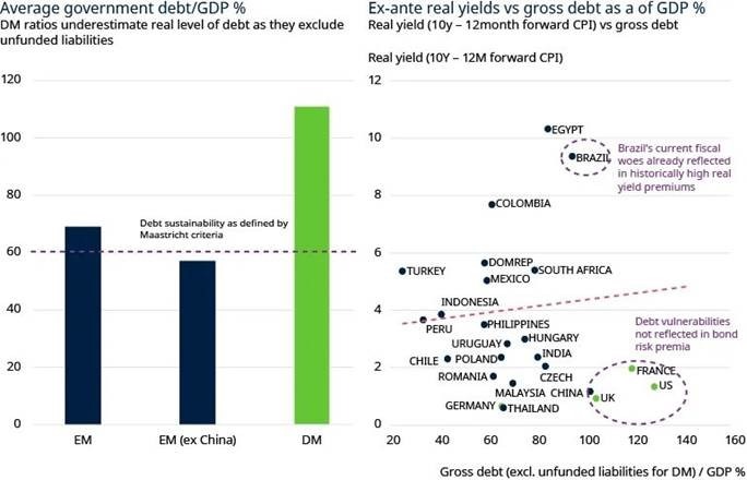 Esta deflação exportada pela China é particularmente benéfica para economias emergentes com barreiras comerciais reduzidas e baixa sobreposição de exportações com a China – nomeadamente vários exportadores de matérias-primas na América Latina, Europa de Leste, Médio Oriente e África. Com esta perspetiva favorável, as taxas de juro reais permanecem desnecessariamente elevadas nos mercados emergentes e as yields das obrigações soberanas locais a 10 anos continuam a oferecer valor atrativo. Esta atratividade é reforçada por uma melhoria nas dinâmicas da dívida pública EM, sobretudo em comparação com as economias desenvolvidas (Figura 3).