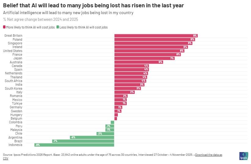 A inteligência artificial ocupa um lugar central nas previsões para 2026. O estudo revela que 67% dos cidadãos acreditam que a IA irá destruir muitos postos de trabalho, enquanto 43% admitem que poderá criar novas oportunidades, uma tensão que atravessa praticamente todos os países analisados.