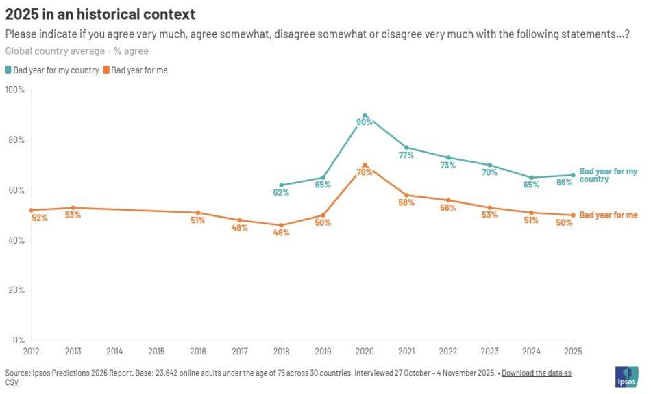 2025 trouxe dissabores a mais de metade da população. De acordo com o relatório, 66% dos inquiridos consideram que 2025 foi um mau ano para o seu país, e 50% dizem o mesmo em relação à sua vida pessoal e familiar, revelando um clima global de desgaste económico e social.