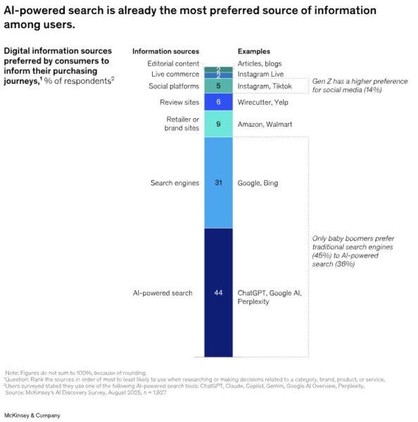 Por exemplo, em setores como bens de consumo embalados e serviços financeiros, mais de 65% das fontes em pesquisas baseadas em IA são editoras (revistas e microsites), conteúdo gerado por utilizadores e sites afiliados, de acordo com o estudo da McKinsey.